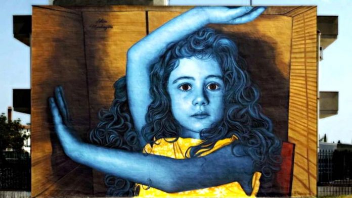 Mural of a little girl on the side of a building wall in Stornara, Italy. In the mural, her skin is tinted blue, she has wavy hair and she is wearing a yellow dress, with one hand over her head and one across her body, seemingly within a box